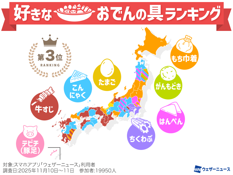アプリ「ウェザーニュース」ユーザーに「1番好きなおでんの具は?」と質問し、だいこん、たまご、こんにゃく、はんぺん、こんぶ、もち巾着、ちくわぶ、牛すじ、その他の9つから選択していただきました。