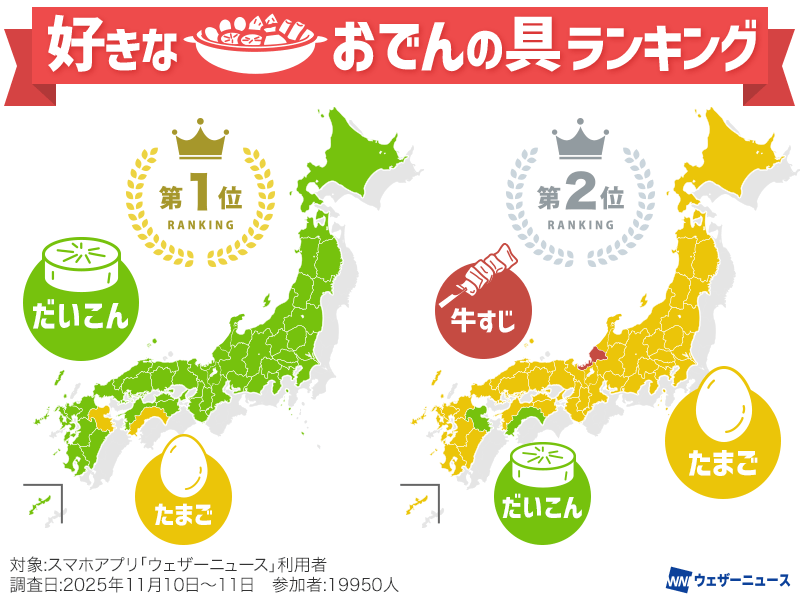 都道府県別のランキングを見てみても、47のうち45都道府県で1位がだいこん、44都道府県で2位がたまご。1位が「だいこん」ではない高知と大分でも2位が「だいこん」となり、全国的にだいこん&たまごの人気が圧倒的であることがわかりました。大分は「たまご」と「だいこん」の割合の差は1ポイント未満でした。