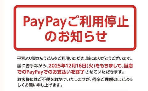 資さんうどんは12月16日、店頭の飲食代金の決済において「PayPay」の取り扱いを停止した。クレジットカードを始めとする他のキャッシュレス決済については引き続き利用できる。