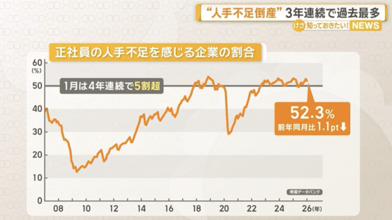 >帝国データバンクによりますと、正社員の不足を感じている企業は52.3%と、1月としては4年連続で5割を超えました。