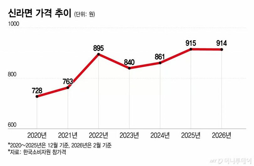 値上がり率も、他の食品や外食メニューに比べれば相対的に低い。農心の辛ラーメンは2020年の728ウォン(約77円)から2026年は